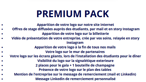 Ici, découvrez les différents services que nous proposons ainsi que les différents packs qui leur sont attribués. Il va sans dire que nous avons besoin de votre aide pour réaliser ce projet. Grâce à votre soutien, vous pouvez permettre à l’association Mercure de perdurer dans le temps et d'organiser le plus beau des galas pour nos étudiants.